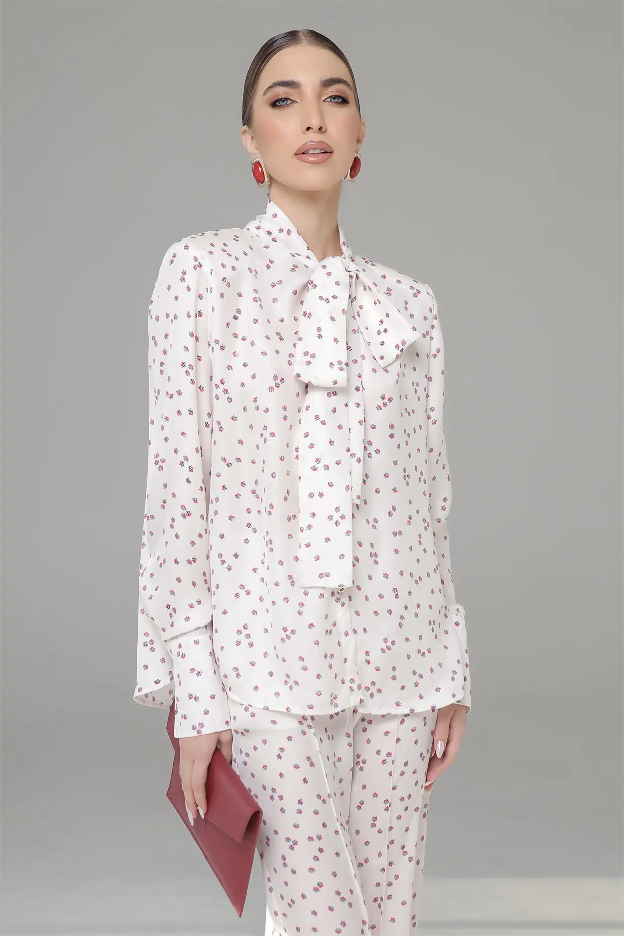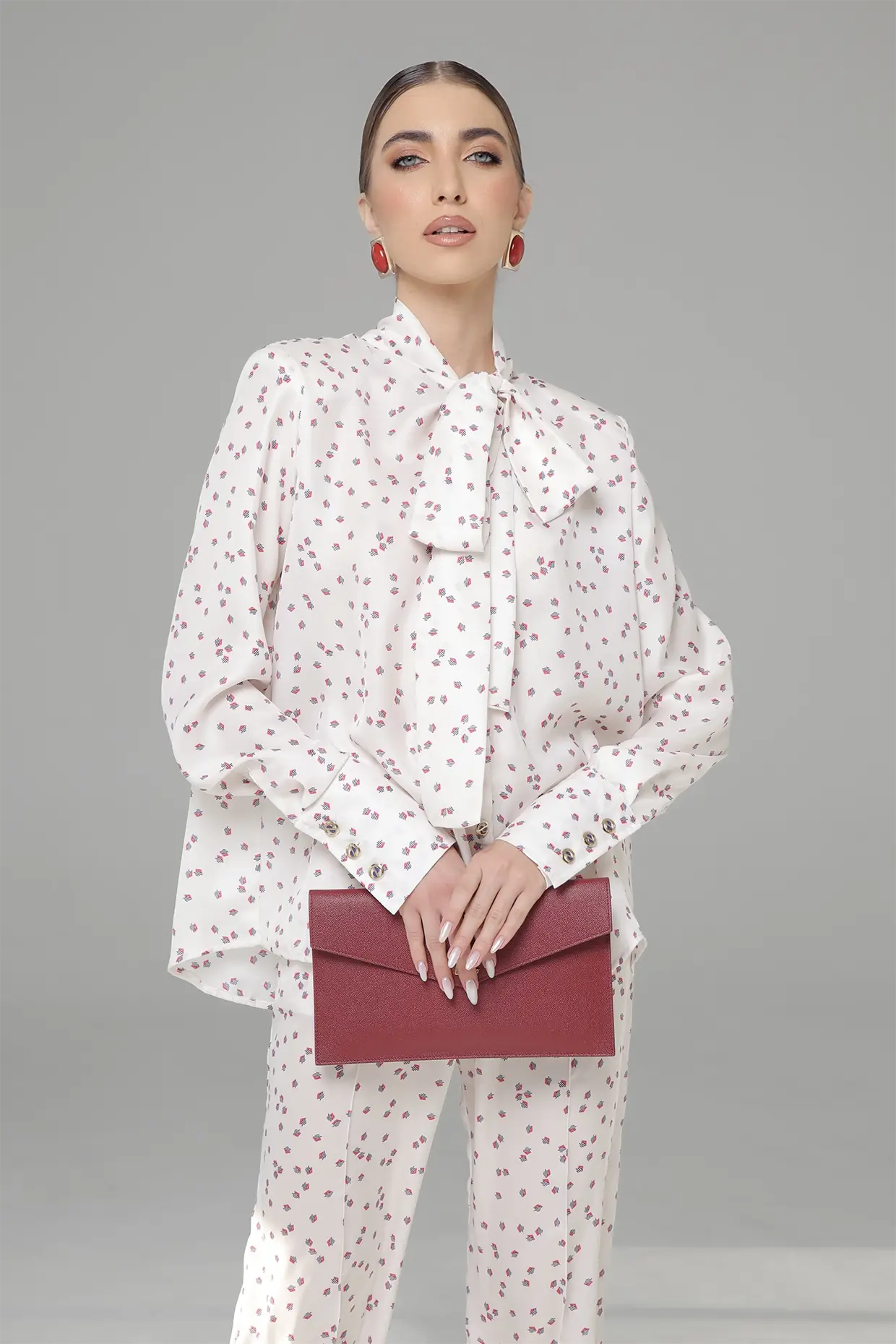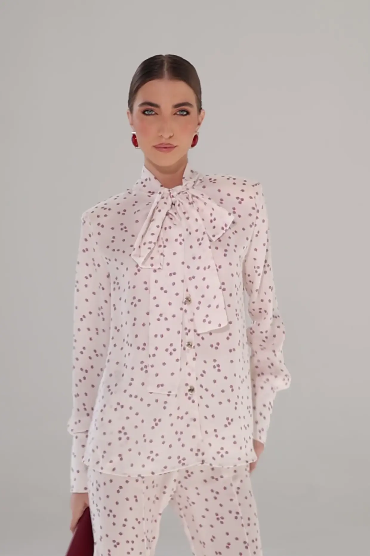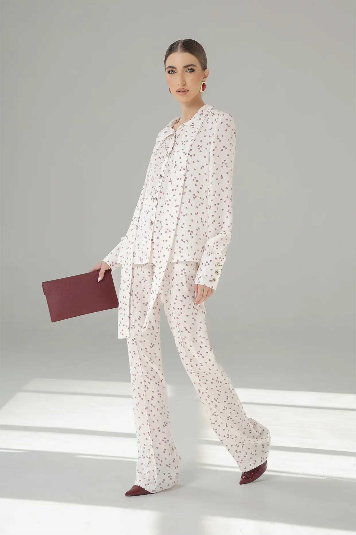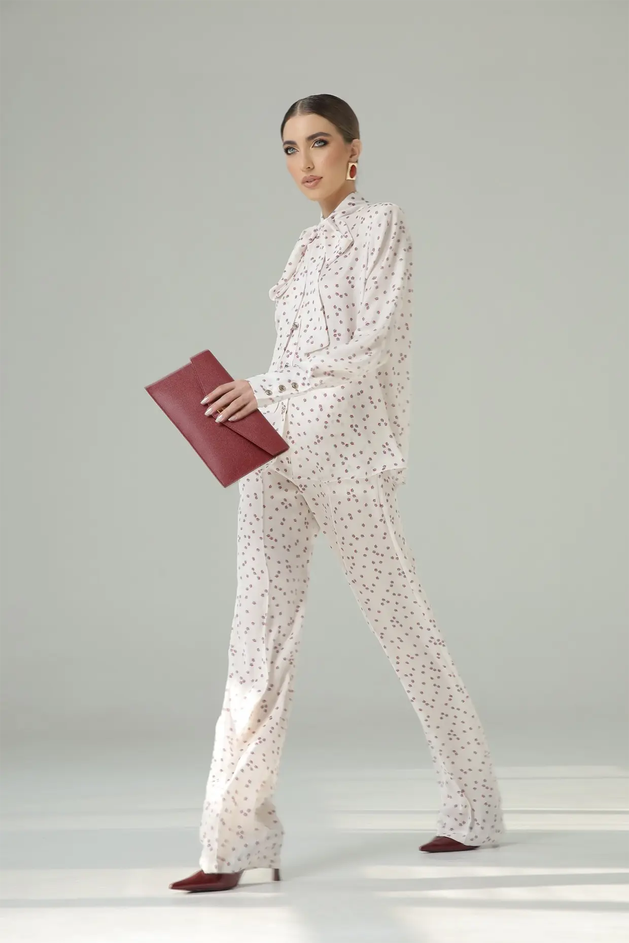 Unesite romantičan i elegantan duh u svoj stil uz ovaj sofisticirani svilenkasti komplet. Košulja sa diskretnim printom i malim naramenicama donosi suptilnu strukturu, dok mašna pruža raznovrsne opcije – može se nositi opušteno za ležerniji izgled ili vezana za formalniji efekat. Široki kroj obezbeđuje udobnost i slobodu pokreta. Ravne pantalone sa dugim nogavicama vizuelno produžavaju figuru, a njihov klasičan kroj i mekani materijal čine ih idealnim za različite prilike – od poslovnih sastanaka do outfita za vecernji izlazak ili proslavu.