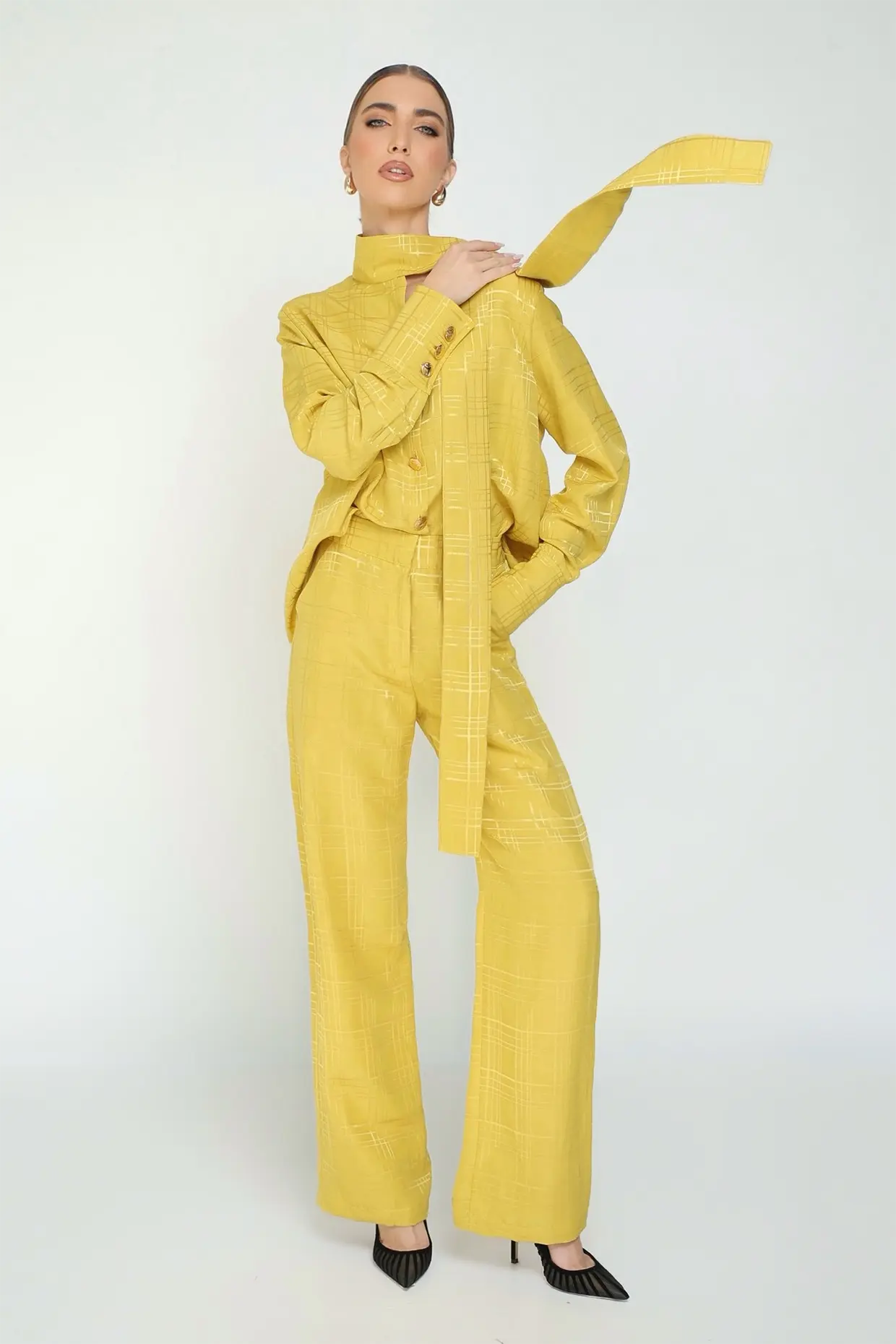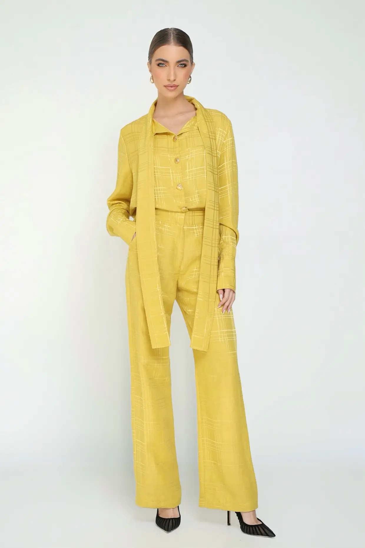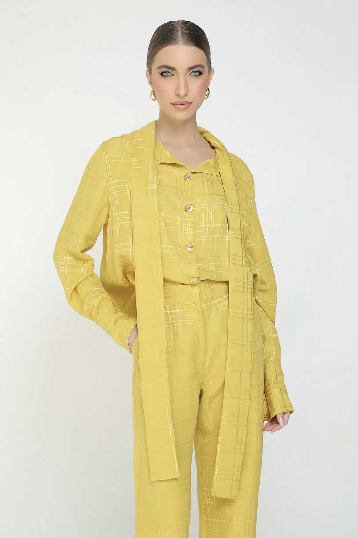 Unesite boje i energiju u svoj stil uz ovaj upečatljivi svilenkasti komplet. Košulja s visokim okovratnikom i efektnim a jednostavnim krojem, ukrašena dužom trakom koja se može vezati za dodatnu eleganciju. Ima sofisticirani dezen sa diskretnim linijama koji naglašava luksuzni izgled. Pantalone ravnog kroja, udobne i elegantne, idealne za dnevne i večernje kombinacije.