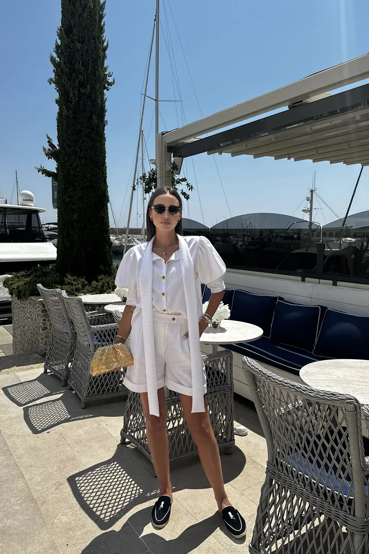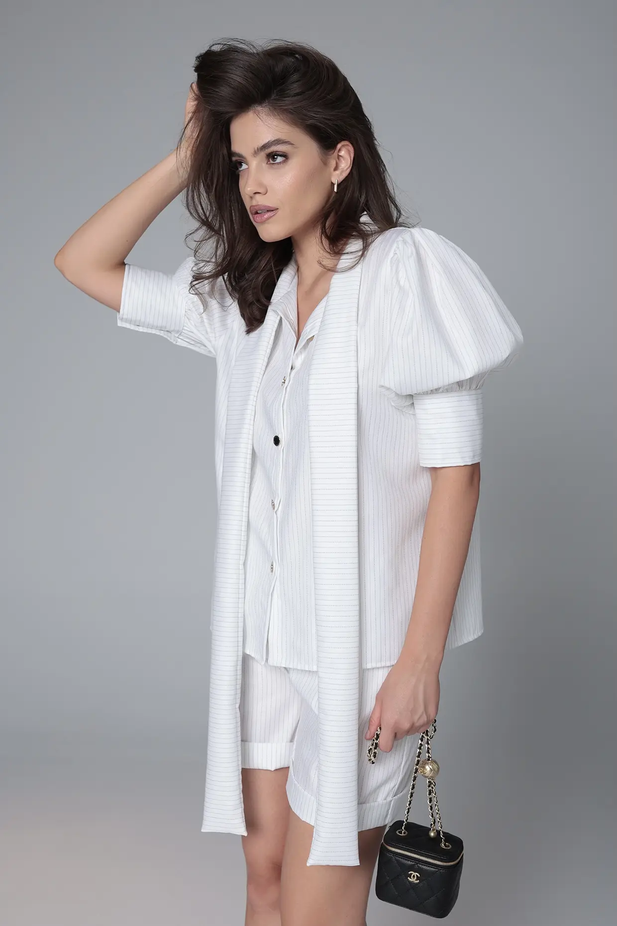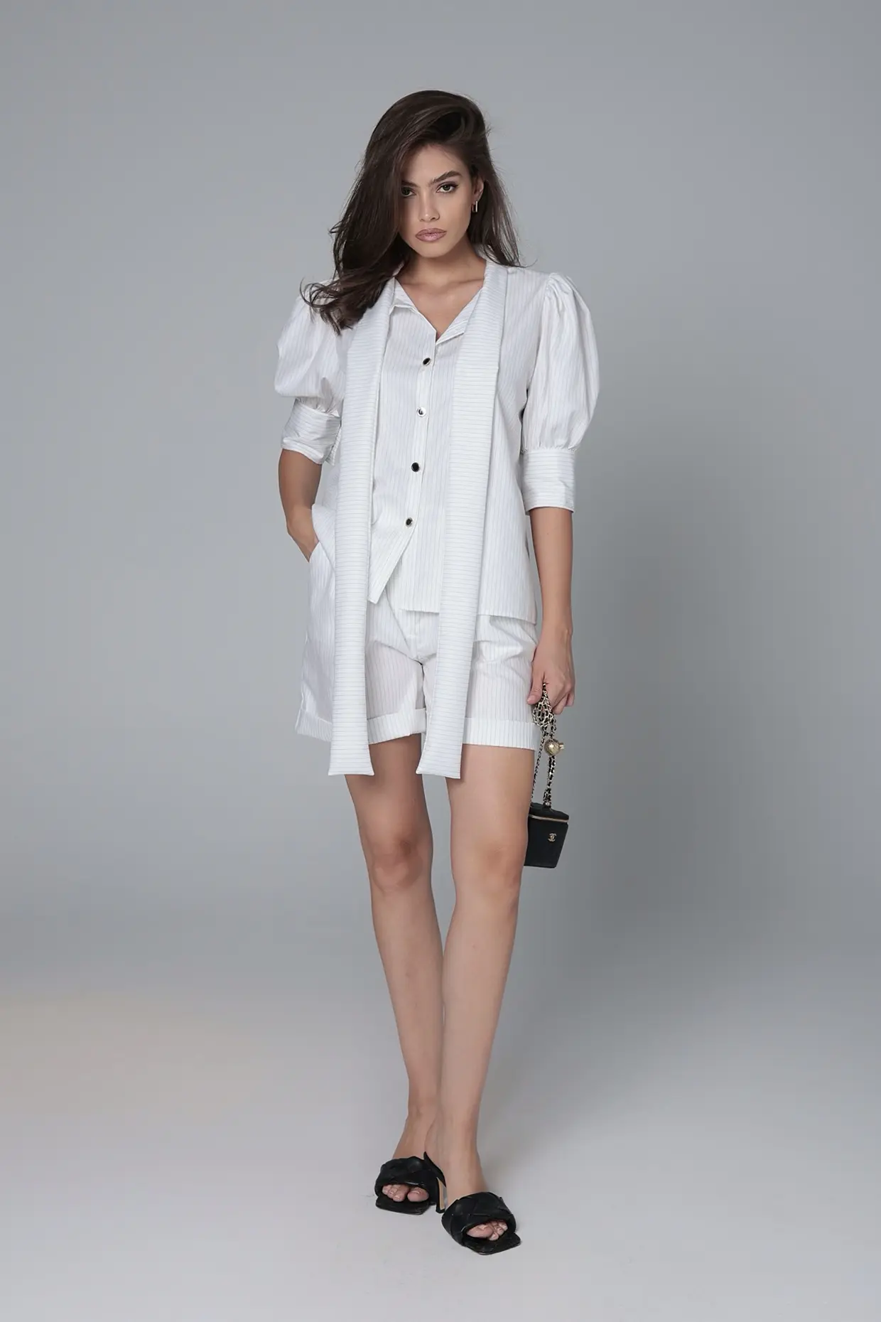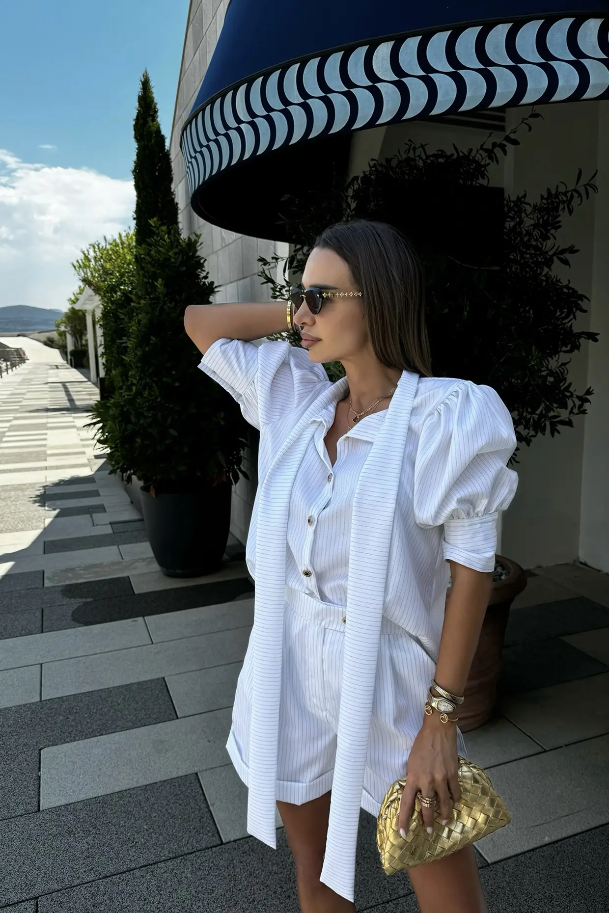 Lana set u beloj nijansi sa suptilnim crnim linijama donosi svežinu, jednostavnost i šik eleganciju u jednom. Izrađen od premium italijanskog pamuka, kombinuje klasičnu formu sa modernim detaljima poput puf rukava i vezivanja oko vrata. Minimalistički, a upečatljiv – idealan za sofisticiran letnji stil koji ne prolazi nezapaženo.