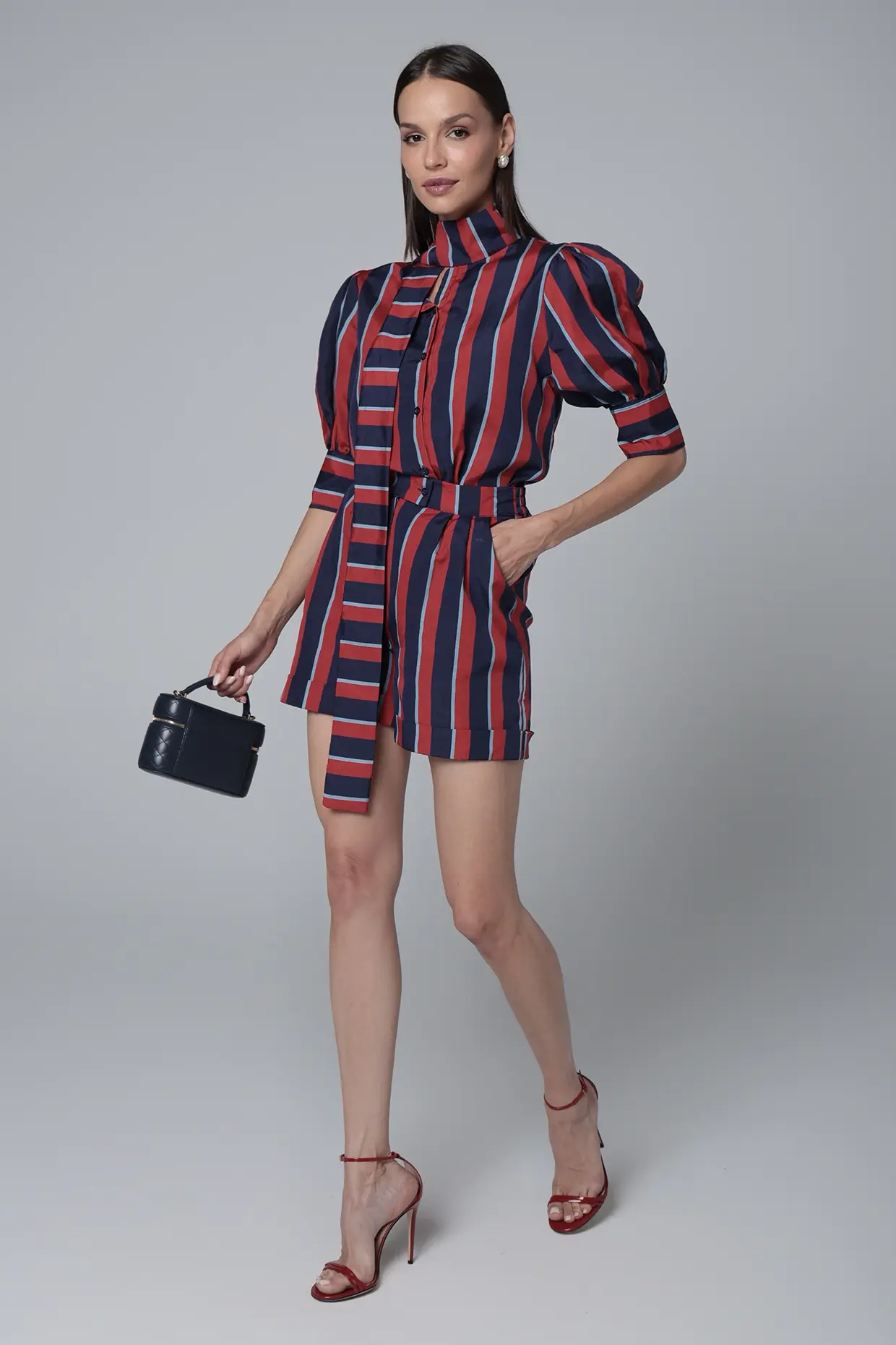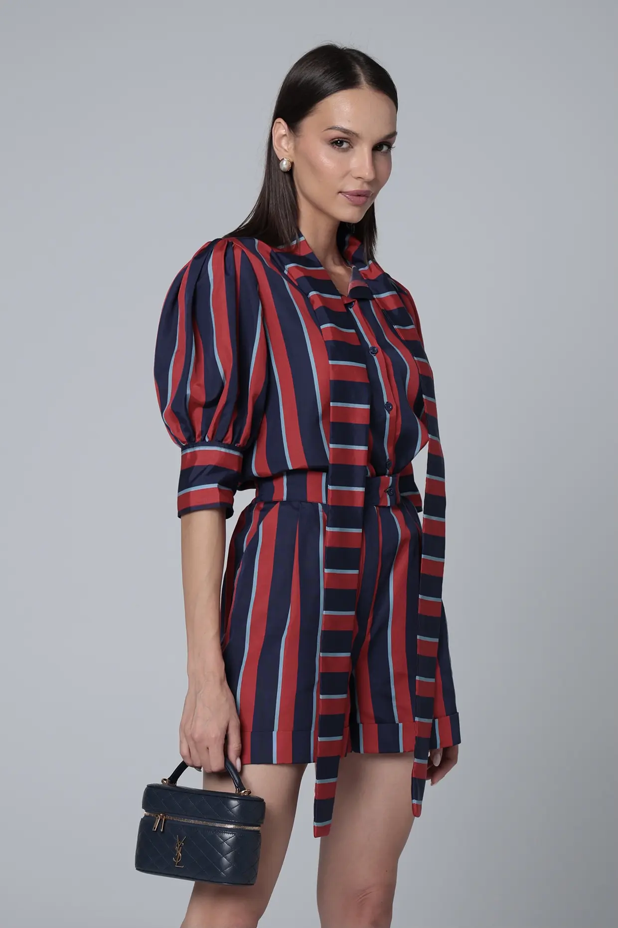 Lana je pamučni set inspirisan retro elegancijom, idealan za tople letnje dane kada želite da izgledate dotjerano bez trunke napora. Kombinacija bogatih boja i pruga, naglašeni struk, puf rukavi i duga traka oko vrata daju mu karakter i sofisticiranost. Možete je vezivati u mašnu, pustiti da pada ili nositi ležerno prebačenu – uvek sa stilom. Savršen izbor za gradske šetnje, koktel večere ili letnje večeri pod otvorenim nebom.