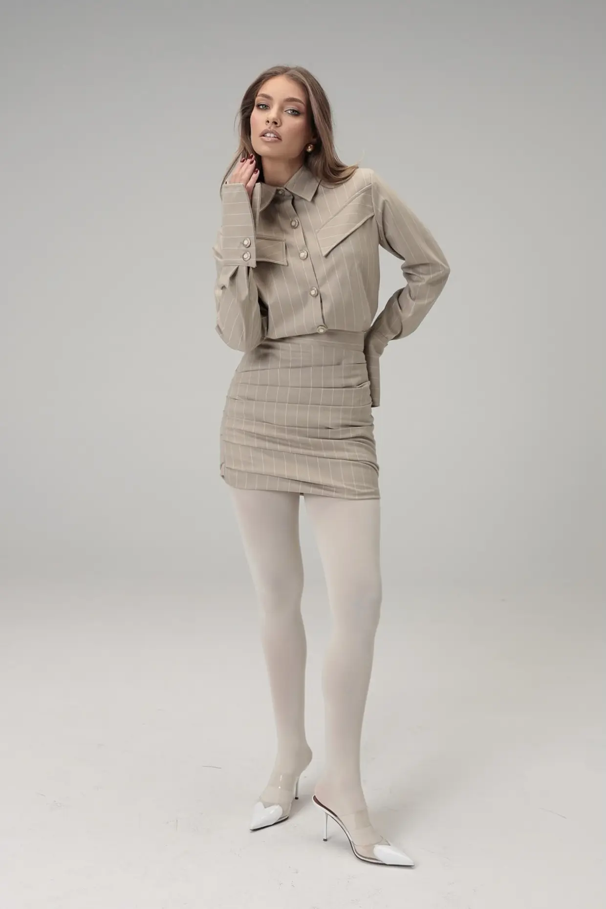 Elegantan komplet izraðen od kvalitetne italijanske vune u bez boji s prugama, sastoji se od moderne mini suknje sa naborima i košulje sa kosim lažnim džepovima. Košulja ima izražene manžete s detaljima dugmadi, koje dodaju sofisticiran dodir. Set je lako uklopljiv uz čizme, bilo ravne ili na štiklu, i savršen je izbor za dnevne kombinacije, ali i večernje izlaske.