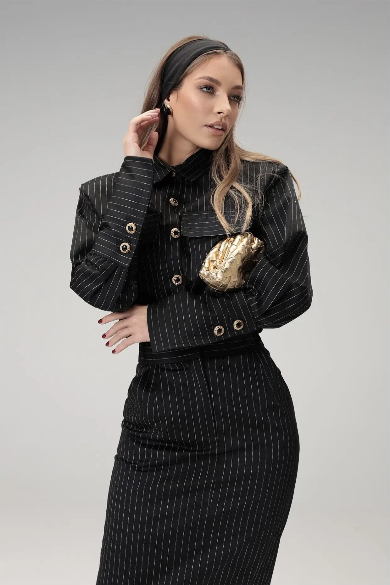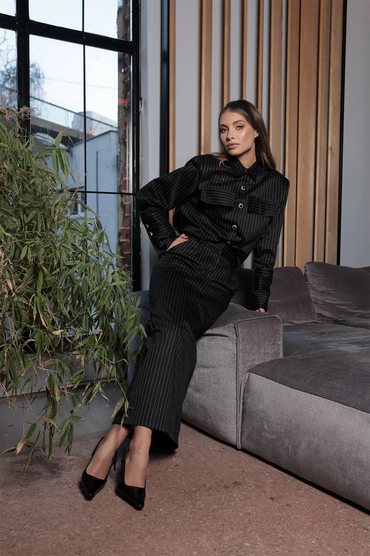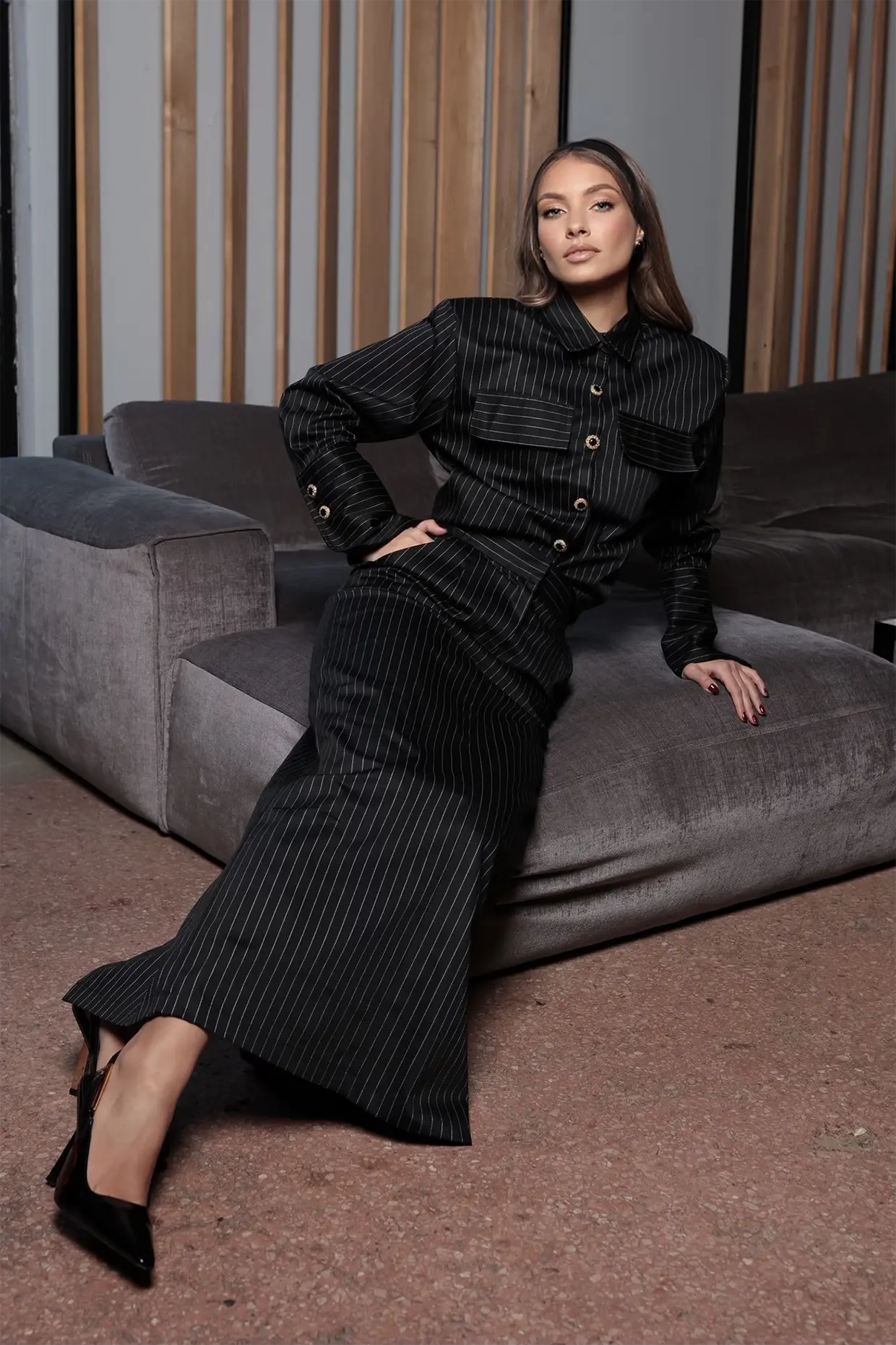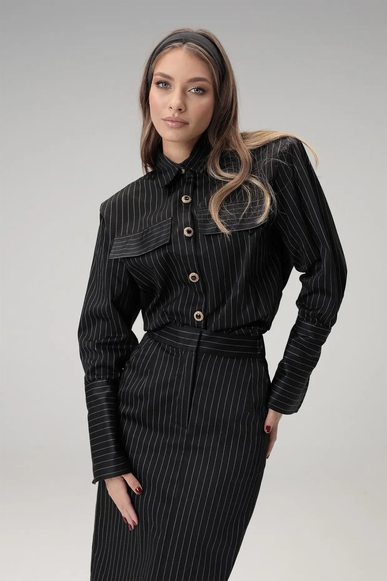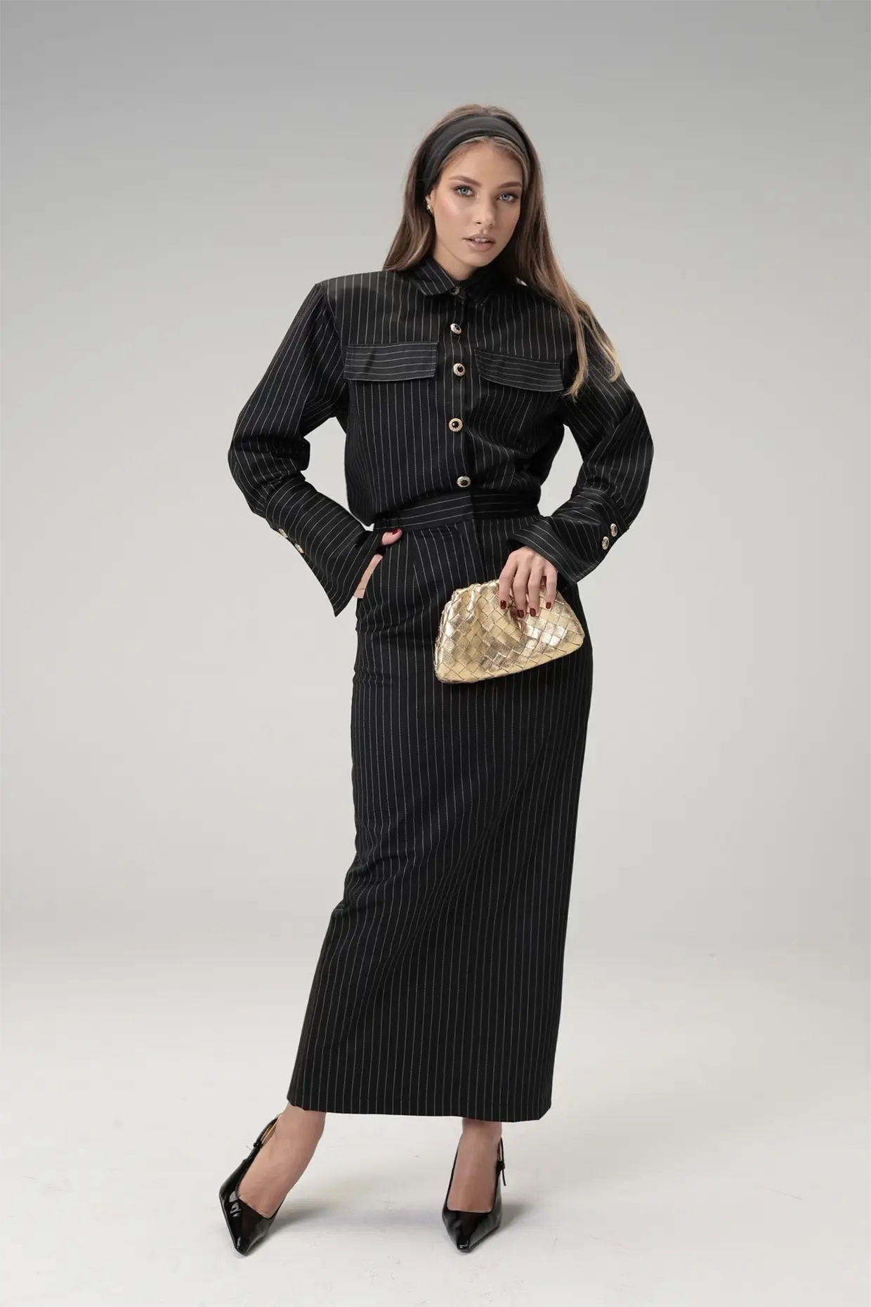 Elegantni komplet koji odiše sofisticiranošću i modernim dizajnom. Košulja sa naglašenim ramenima daje moćan izgled, dok elegantni dugmići dodaju suptilnu notu luksuza. Suknja dužine do članaka prati liniju tela, stvarajući profinjen i ženstven siluetu. Idealna kombinacija za poslovne prilike ili večernje izlaske uz zlatne ili crne modne dodatke.