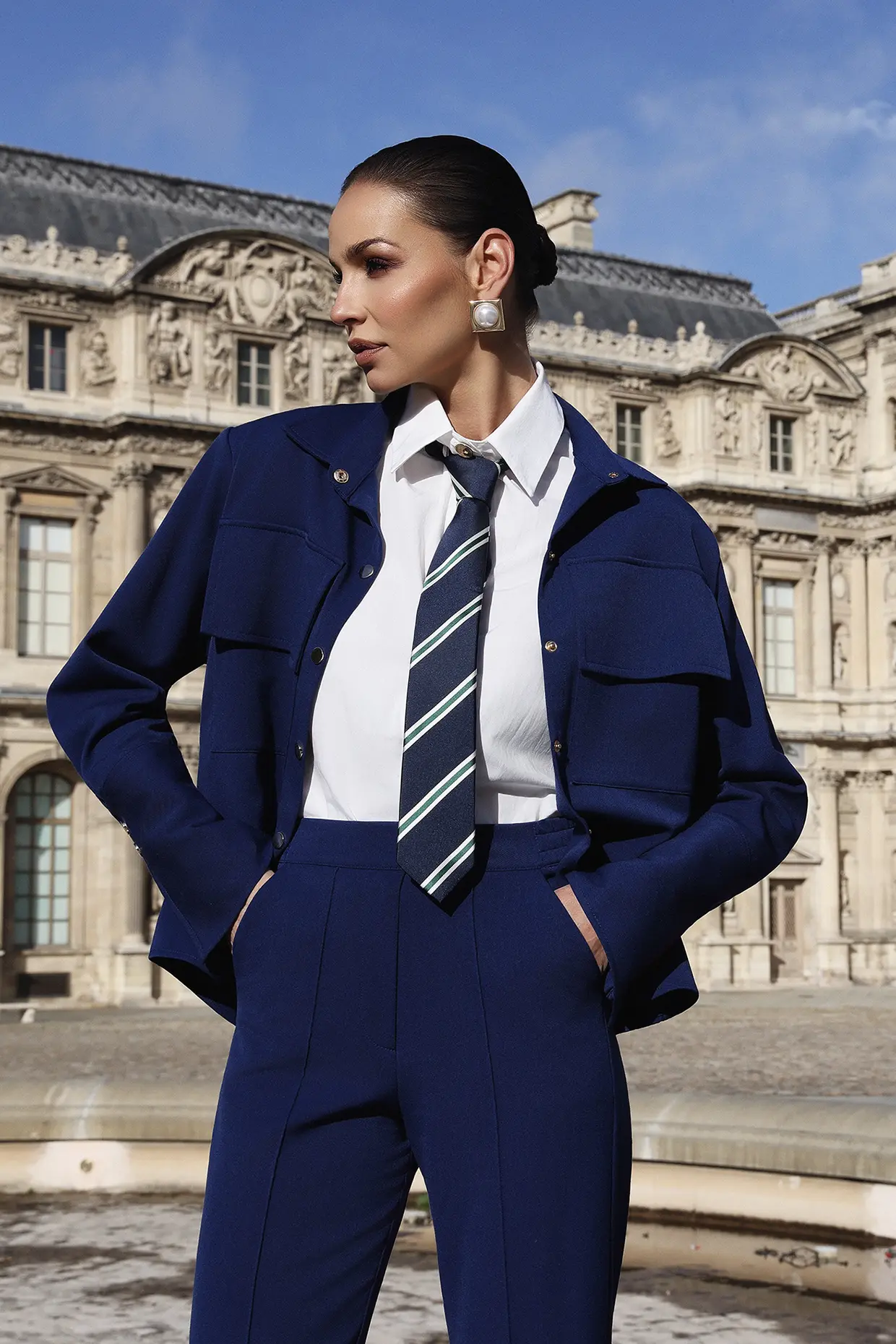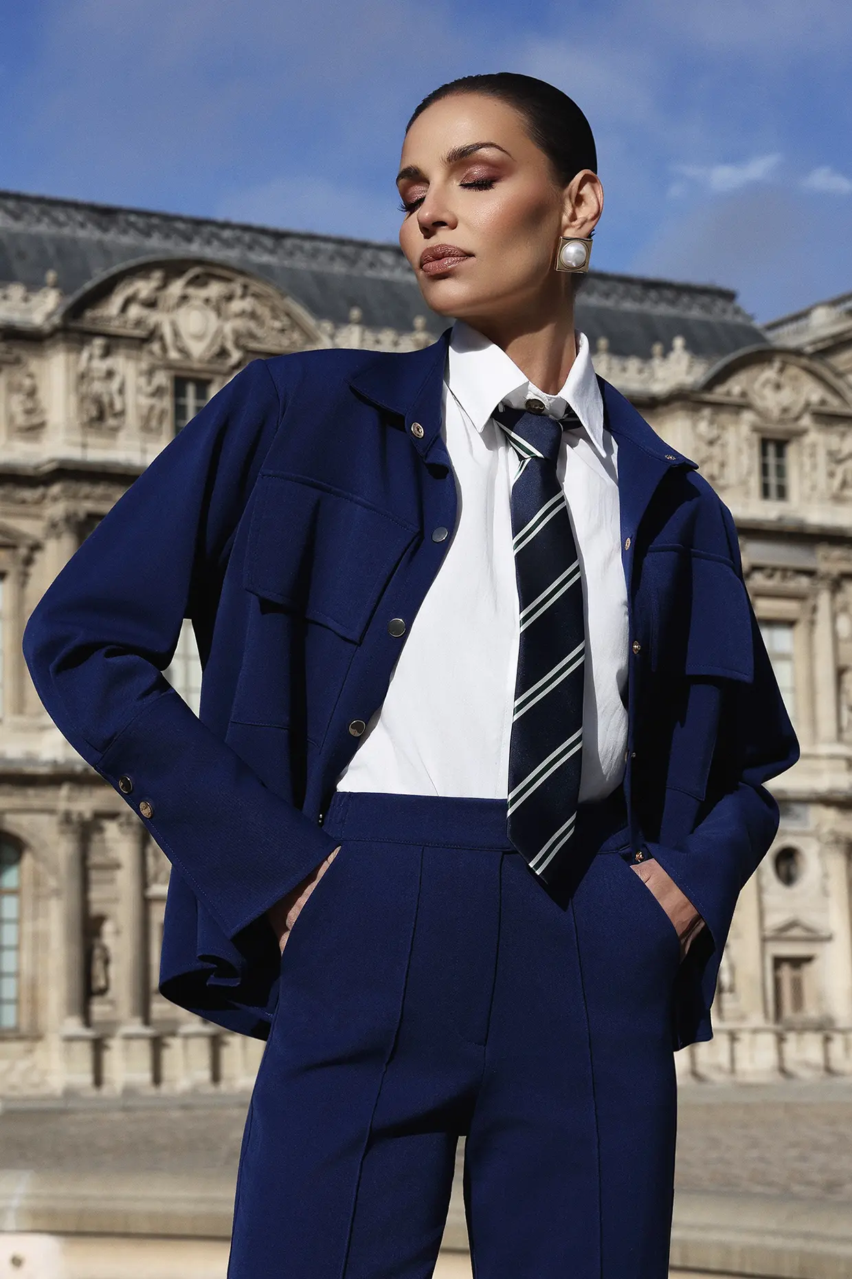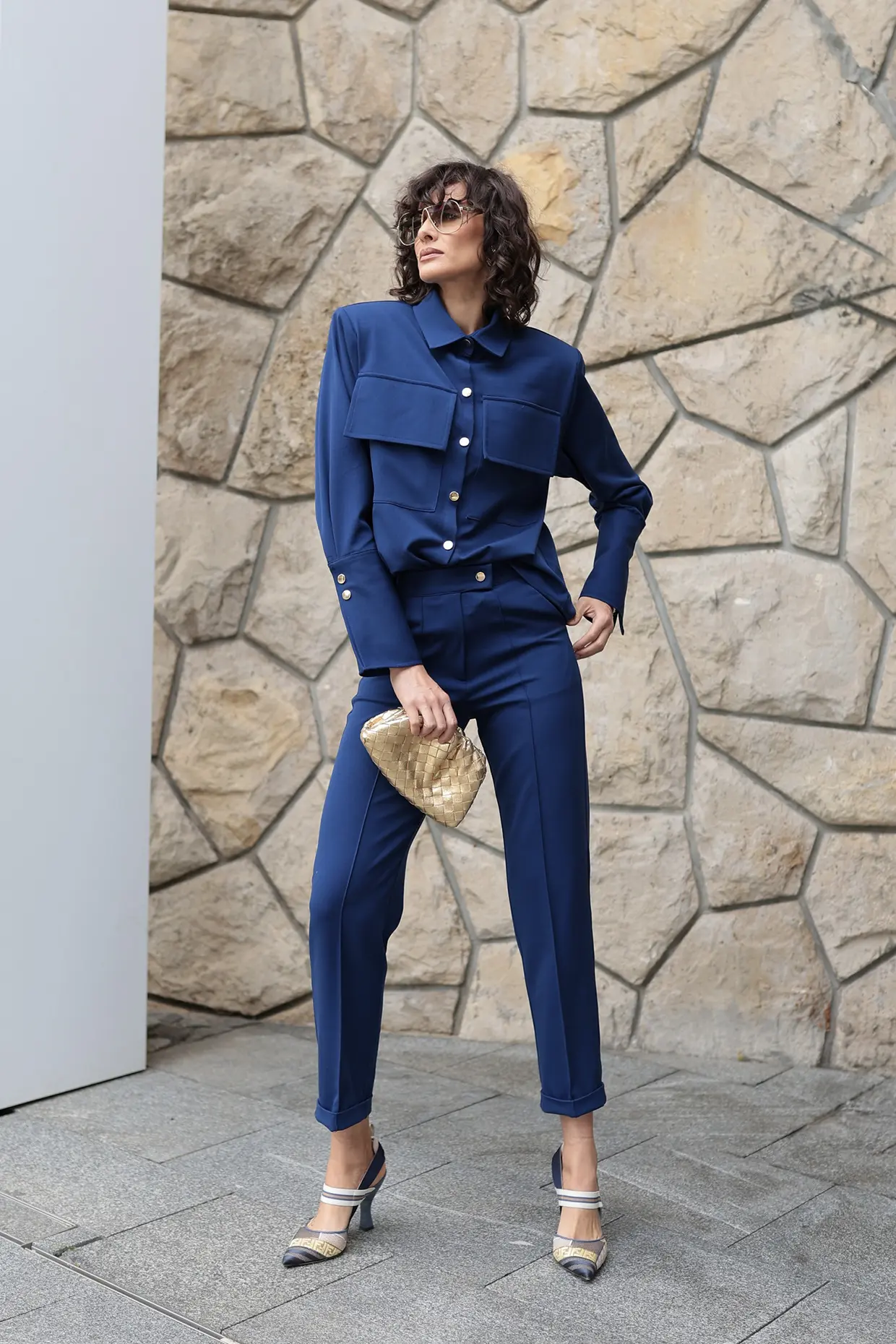 Sasha set predstavlja savremenu interpretaciju klasične profinjenosti. Košulja je krojena sa precizno postavljenim naramenicama, duplim džepovima i zlatnim drikerima koji daju diskretan, ali prepoznatljiv akcenat. Linija je čista, strukturisana i jasno definisana, stvarajući oblik koji vizuelno izdužuje figuru.
